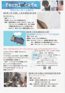 ~fermi cafe~ 学校以外に学べる場所を 2025年10月16日(木)から2025年12月21(日)の予定です。 チラシをご覧ください。