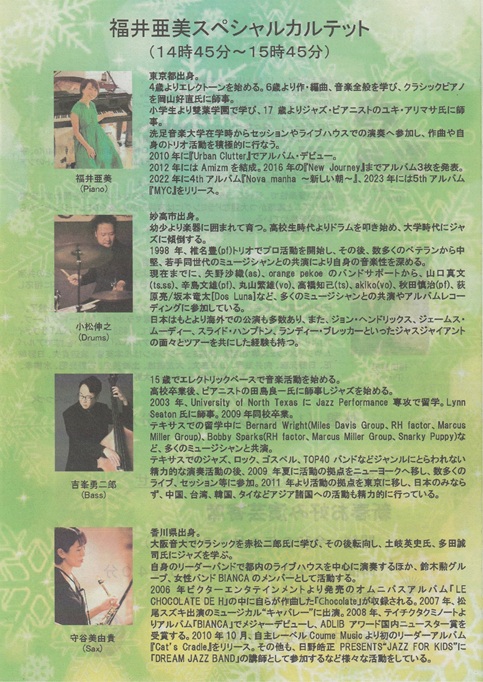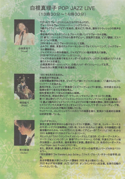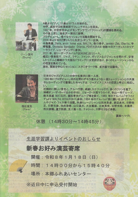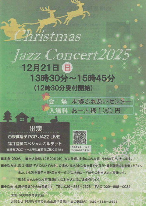 Christmas Jazz Concert2025 ~生涯学習課~日 時:12月21日(日)13時30分~15時45分 (12時30分 受付開始)会 場:本郷ふれあいセンター入場料:お一人様 1,000円定 員:290名 申込締切:12月20日(土) ※先着順 定員になり次第、受付終了申込方法:上記チラシをご覧ください