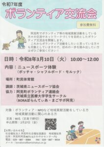 ボランティア交流会 ~阿見町社会福祉協議会~ 内容 :ニュースポーツ体験 (ボッチャ・シャフルボード・モルック) 日時 :令和8年3月10日(火)10:00~12:00 場所 :町民体育館 講師 :茨城県ニュースポ […]
