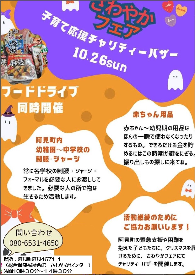 ami seed では、10月26日に開催する、さわやかフェアにて『子育て応援チャリティーバザー』を行います。赤ちゃん用品や学生服、指定ジャージなども揃えています。